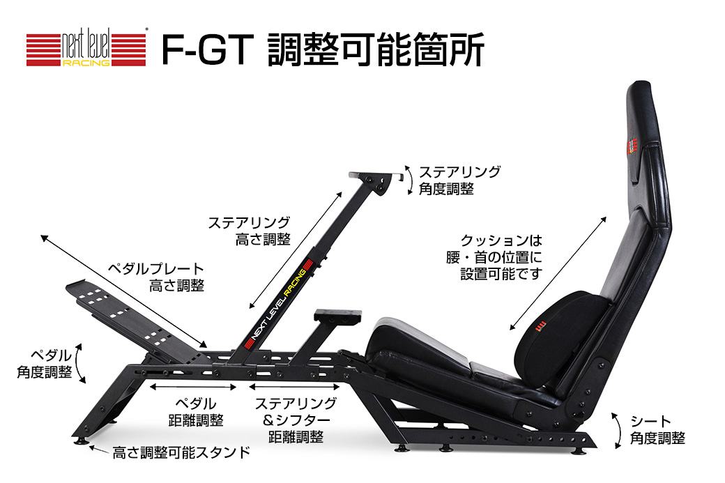F-GTを構成するマットブラックに塗装された剛性の高い金属製フレームは、激しいドライビングにも耐える耐久性と安定感を誇ります。ステアリングコントローラはThrustmaster®、Logitech®(Logicool)、Fanatec®などの主要メーカーに対応しており、ステアリングとペダルの角度&位置が調整可能。最適なドライビングポジションにセットできます。