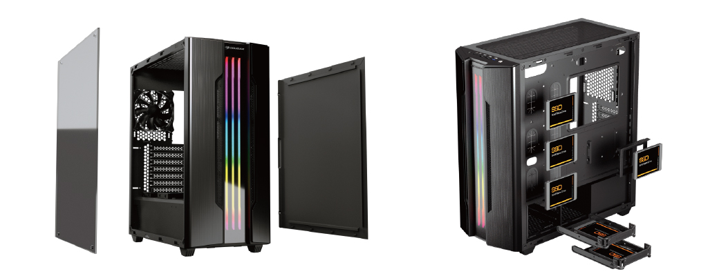 PCケースのフロント部分に3本のRGBを搭載したレンズを採用。パネルのボタンひとつで14種類のRGBカラーを変更できます。さらにCOUGARのファンキットを搭載すると140種類のRGBカラーに変更できます。またマザーボードのRGBと同期が可能なのでマザーボードのソフトを使用しRGBカラーの変更も可能です。