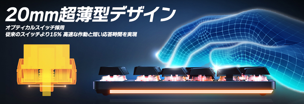 LUXLIMは20mmと従来のメカニカルキーボードの中では超薄型デザイン、手首の疲労感を軽減します。LUXLIMのキースイッチは従来の機械式スイッチではなく、オプティカルスイッチを採用。従来の機械式よりも15%高速な作動と短い応答時間を実現します。また、ロープロファイルのスイッチは従来のスイッチより25%の移動距離削減を実現しています。