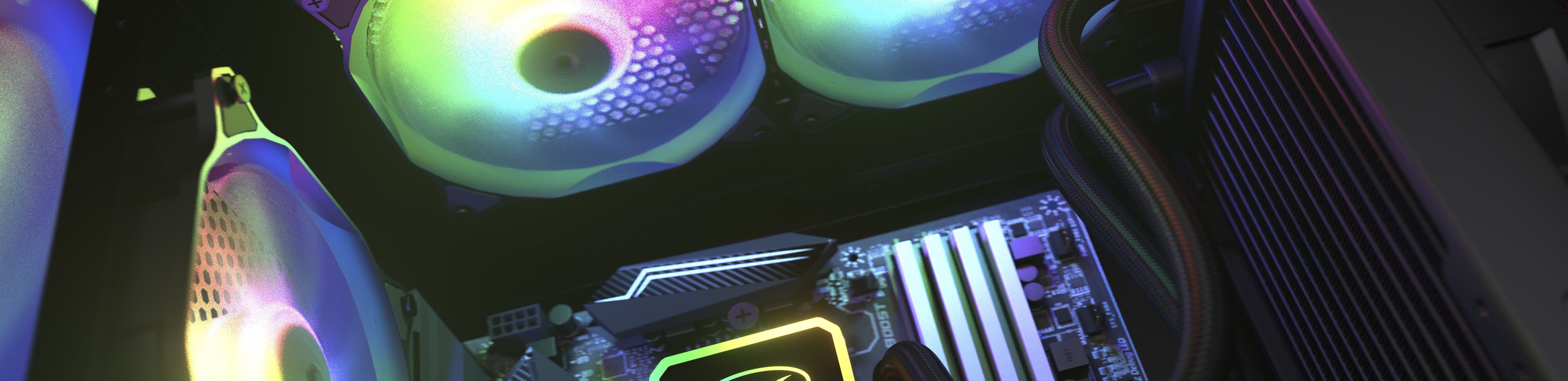 3つのARGBファンが付属、コントロールパネルのRGBボタンを使用することで、複数の照明効果を切り替え可能です。また、内臓コントローラーは互換性のある5V ARGB接続にも適応可能で、システム全体の照明を同期させます。