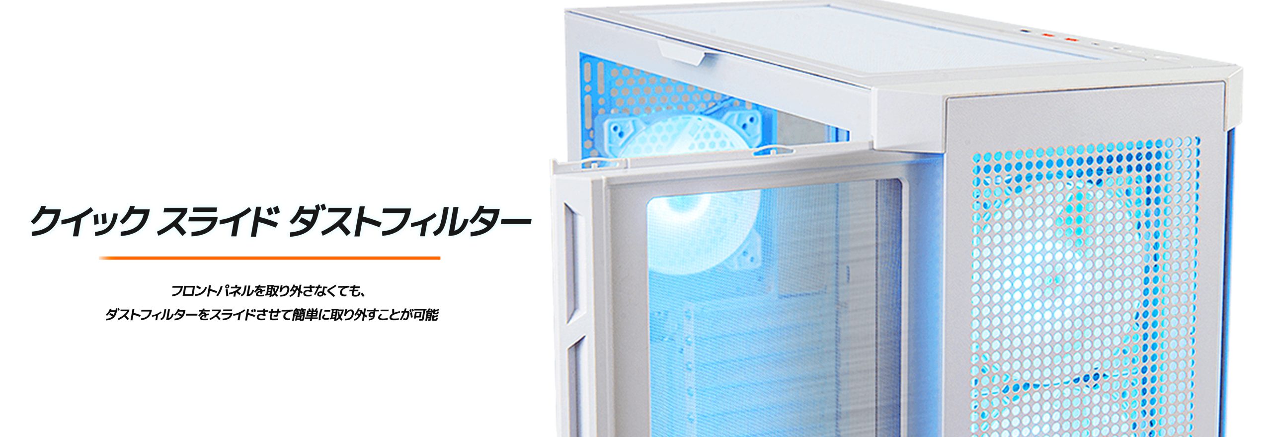 DuoFace Pro RGBの革新的なクイック スライド ダスト フィルターは、フロントパネルを取り外さなくても、ダストフィルターをスライドさせて簡単に取り外すことができます。デザイン性と機能性、どちらも妥協のない優れたPCケースです。