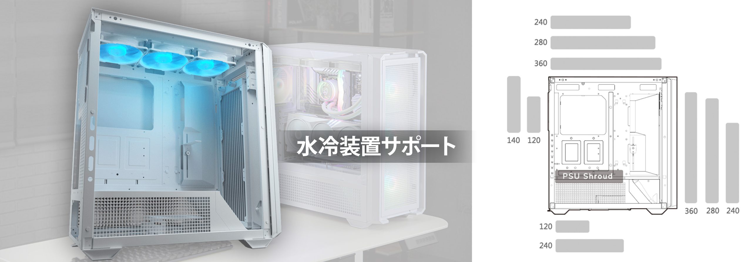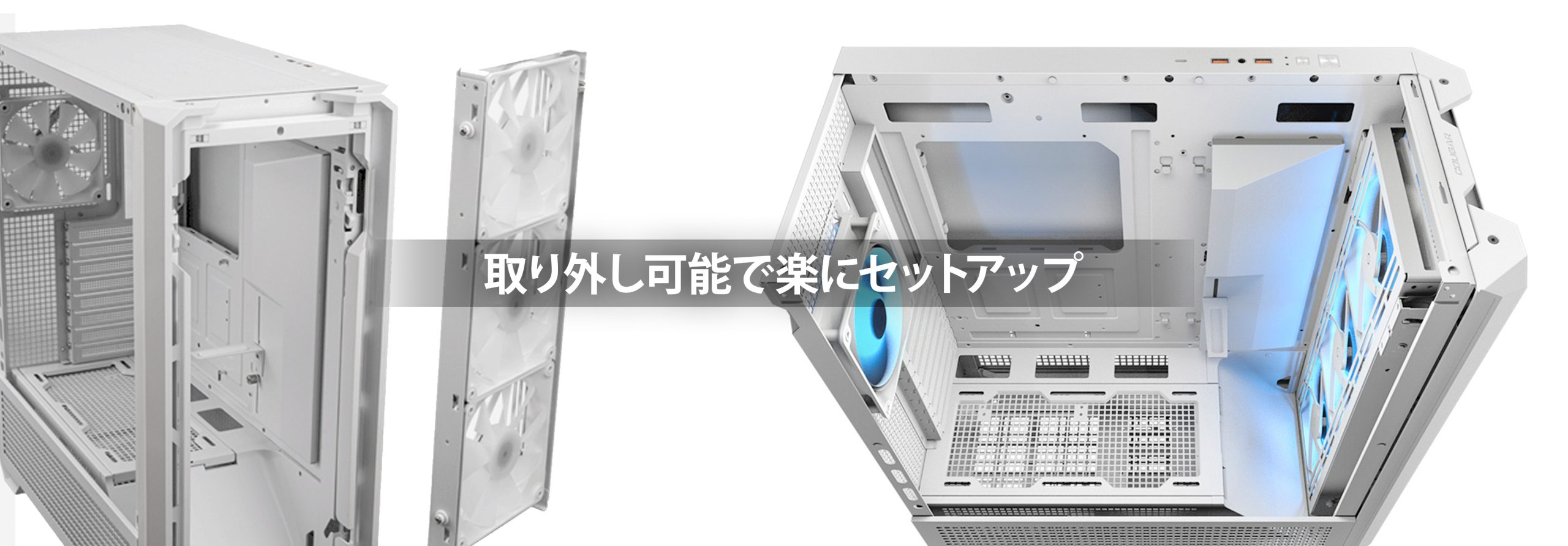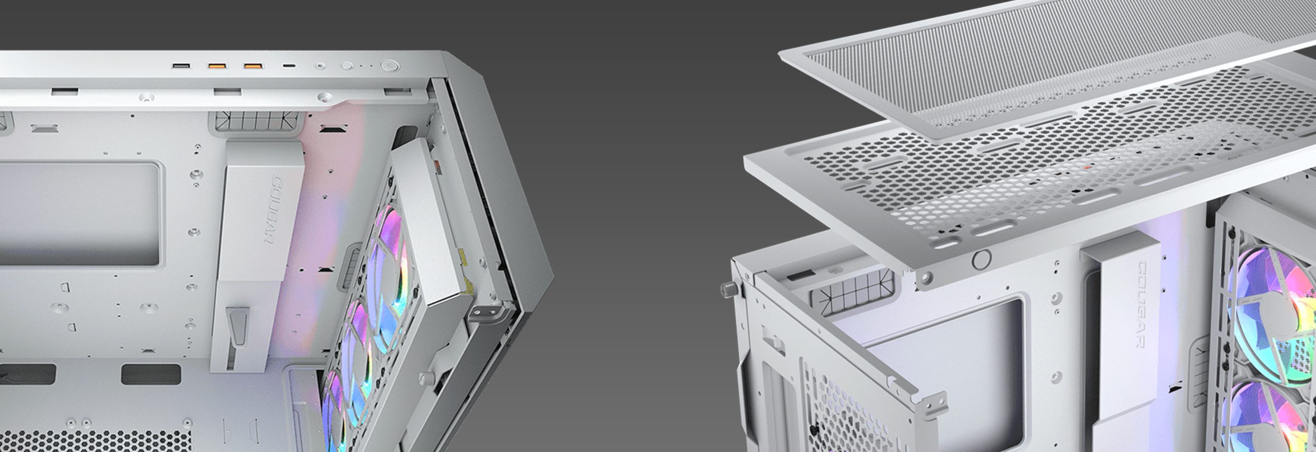 フロントファンブラケットデザインにより、フロントパネルを取り外さずに前面ファンや水冷を取り付けることができ、セットアップがスムーズに行えます。完全に取り外し可能なトップカバーはシステムコンポーネントに豊富なスペースを提供し、取り外し可能な電源ユニットキャビンカバーは簡単に取り付けや変更ができます。ファンまたは360mmの水冷システムはトップカバーに直接取り付けることができ、再取り付け時にしっかり固定されます。
