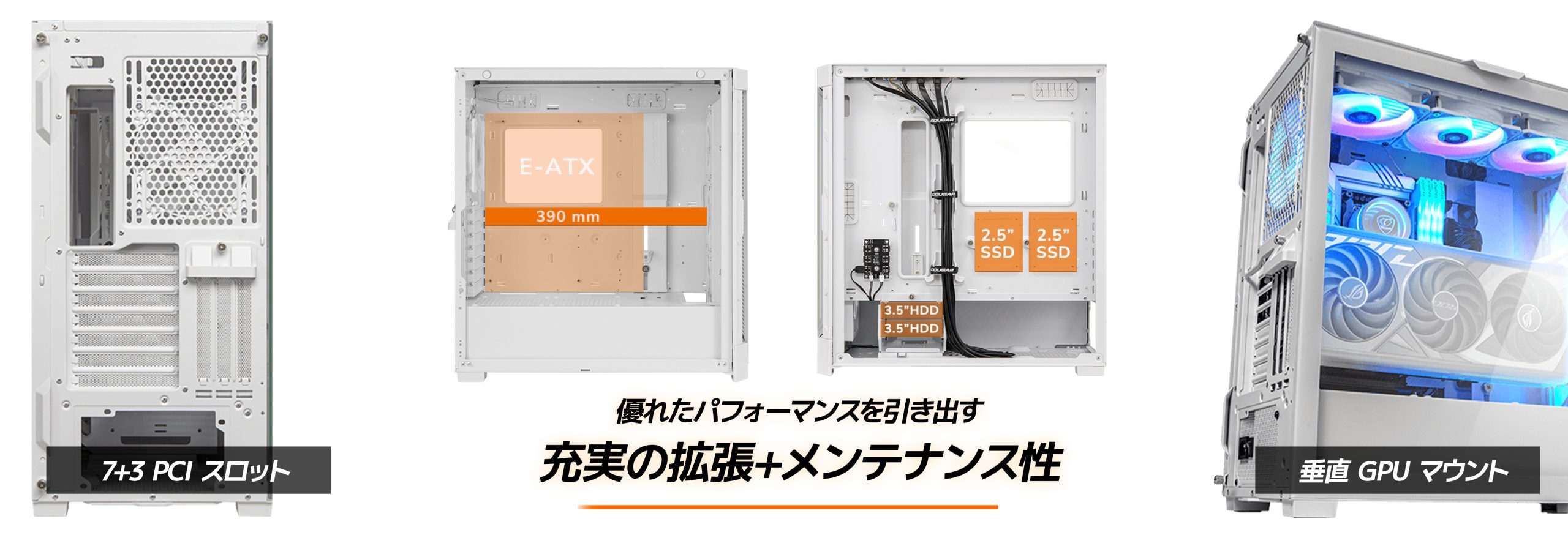MX600 RGBの垂直および水平のGPUの向きをサポートする機能により、より多くのビルドオプションが可能です。GPUサポートブラケットが安定性を保証します(垂直GPUキットが付属)。