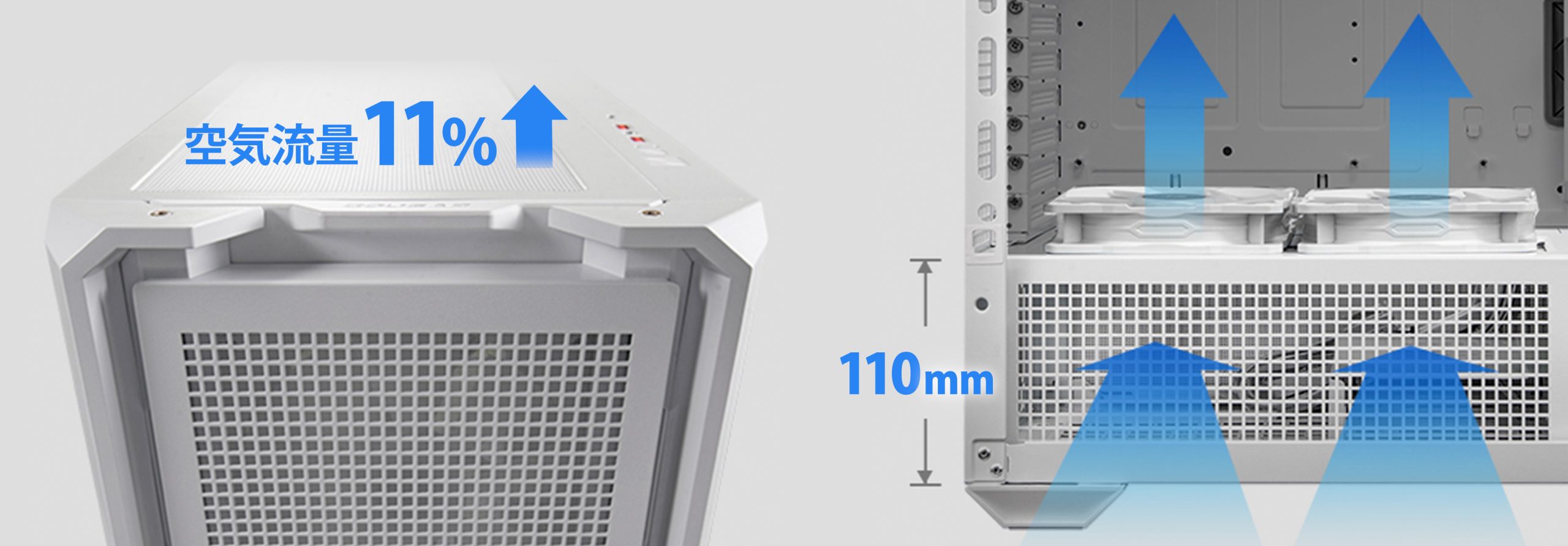 MX600 RGB は、全方向性の完全換気により、上昇する温度に対抗します。(正方形の表面積は同等の直径の円よりも大きいため、正方形の穴は円形のデザインと比較して空気の流れを 27% 増加させます。) 2 つの一体化された角度のある構造 – 1 つはフロント パネルの足元に、もう 1 つは前面パネルの下部にあります。側面 – レーザー精度で気流を CPU とグラフィックス カードに直接導き、最も必要な場所で最も重要なコンポーネントを冷却します。さらに、パワーユニットキャビンには、最適な空気吸入を実現する通気孔付きサイドカバーが装備されており、高さ 110mm によりクリアランスが向上し、効率的な空気循環を実現します。