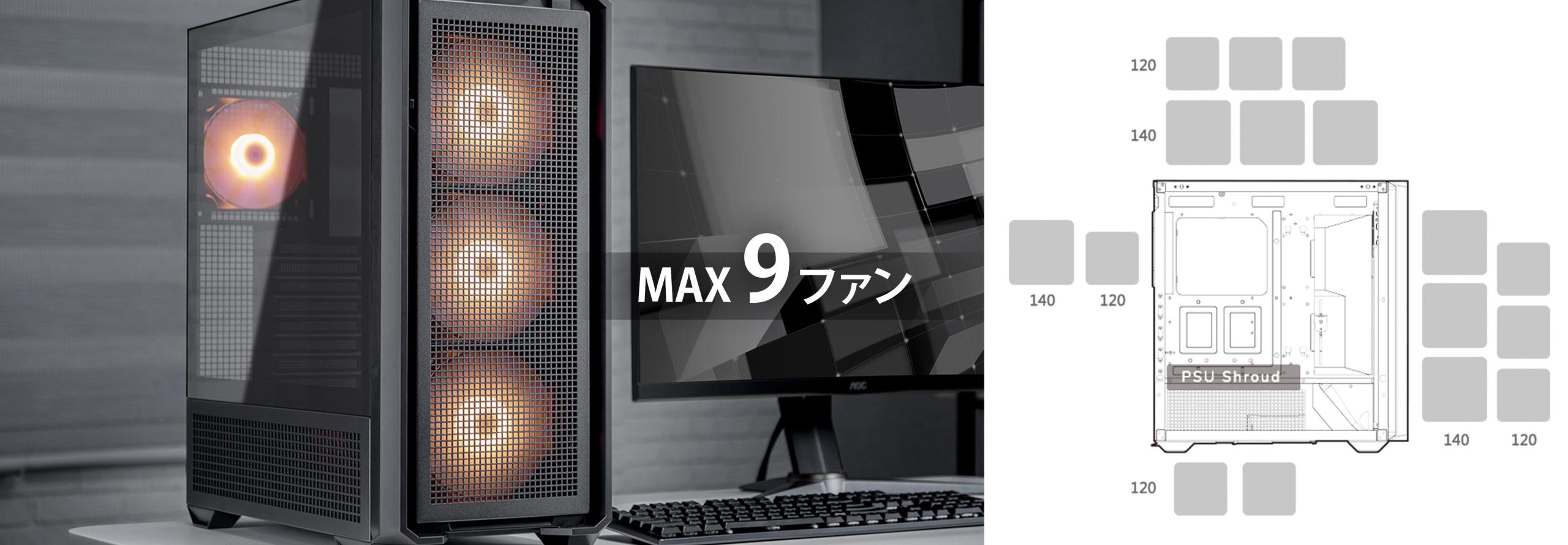 過熱がゲームからあなたを遠ざけることがありません。MX600 RGBには、価格帯において通常の基準を超える事前に取り付けられた120mmのリアファンと3x140mmのフロントPWMパネルファンが付属しており、180mmのエアクーラーを設置する余地があり、ケースの本来の冷却性能を大幅に向上させます。また、電源ユニットキャビンにファンブラケットを備え、トップパネルにさらに3つ追加するオプションもあり、MX600 RGBは合計9つのファンを搭載して、あなたのPCコンポーネントが最高の強度で動作する場所に特化した卓越した冷却能力を提供します。