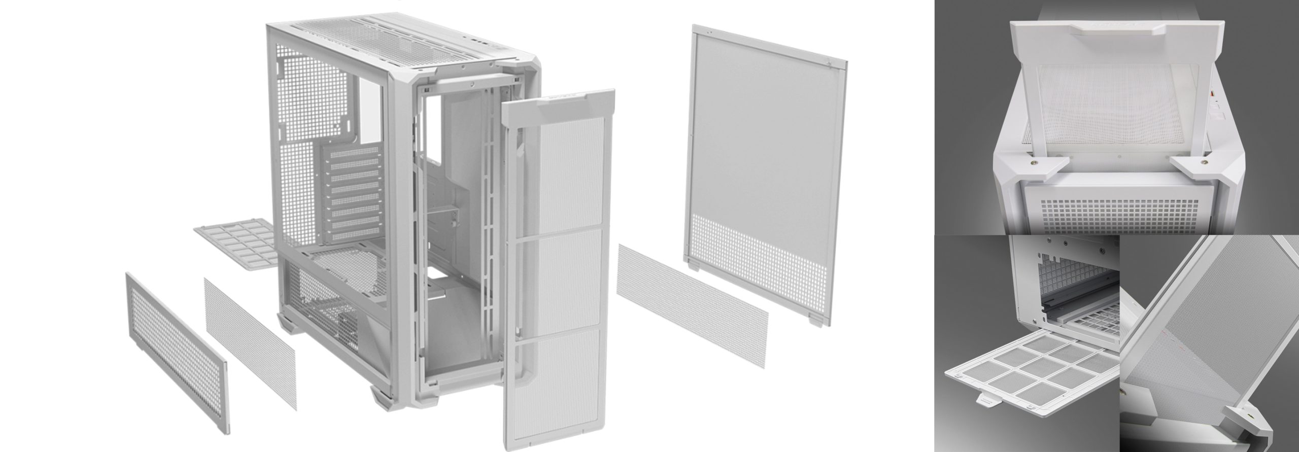 戦略的に配置された5つのフィルターは、貴重なコンポーネントがほこりに浸食されるのを防ぎます。特にクイックスライドのフロントフィルターは、フロントパネルを取り外すことなくアクセスでき、メンテナンス中に浮遊粒子との接触を最小限に抑えます。下から上、側面から前面まで、包括的なフィルトレーションがハードウェアを清潔な状態に保ち、メンテナンスを減らし、PCの寿命を延ばします。