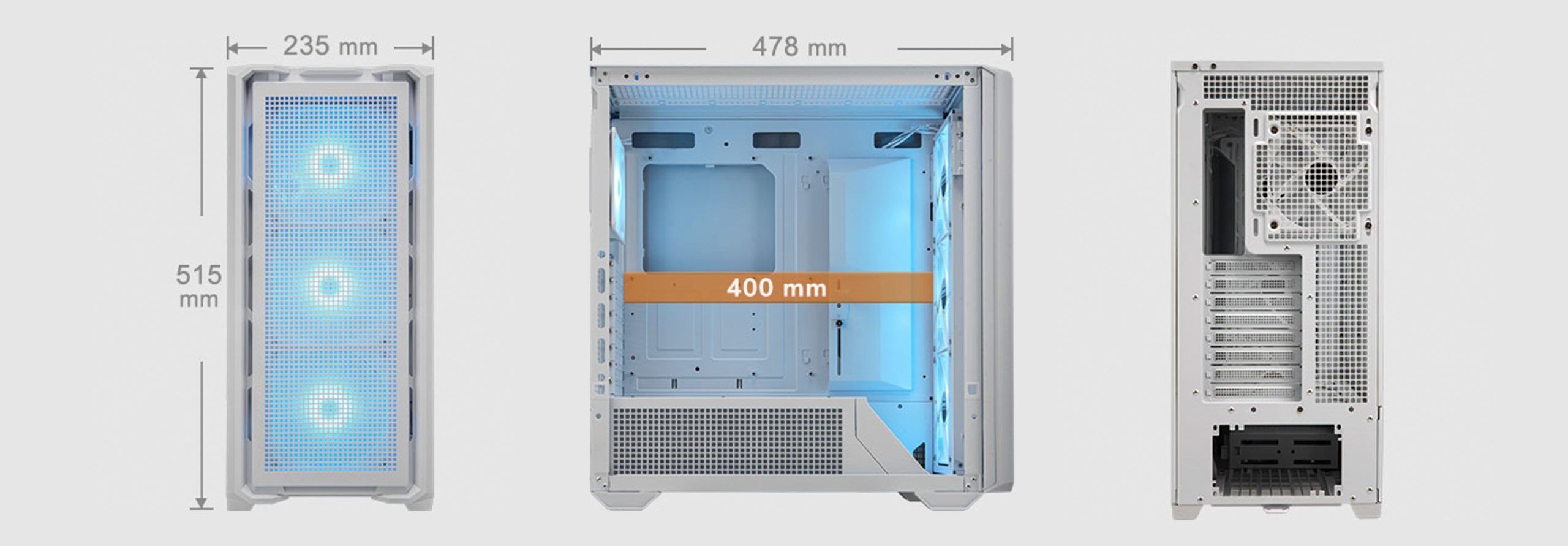 スリムでコンパクトなフルタワー容量のMX600 RGBは、最新の400mm GPUとE-ATXマザーボードと完全に互換性があり、調整可能なケーブルカバーはさまざまなマザーボードサイズにしっかりとフィットし、ケーブルの乱雑さを隠します。ブリッジのない拡張スロットが8つあり、中型タワーのコンパクトな外観を保ちながら、広範なカスタマイズが可能です。