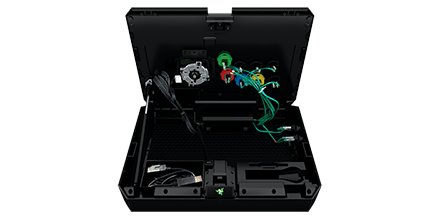 正面部分のRazerロゴボタンを押すとRazer Atroxの内部コンパートメントが開きます。その中には着脱可能なケーブル、ジョイスティック用バットトップ(ナス型レバートップ)、スクリュードライバを収納できる専用スロットに加えて、2つの予備ボタン用スペースがあり、戦闘に必要な武器をすべて収納できる空間が提供されています。