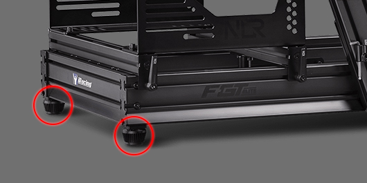 凹凸のあるフロアでも対応するため、各コーナーの高さを独立して調整できる高さ調整脚を設計しました。カスタムデザインの脚は、シミュレーション市場で一般的に使用されている典型的な工業用の脚に比べて見た目の美しさが大きく改善されているだけでなく、振動を吸収し、滑りやすい表面にもグリップ力を発揮するTPE衝撃吸収プラグを採用しています。また、Next Level Racingセーフティステップがコックピットに付属しており、乗り降りが楽になります。