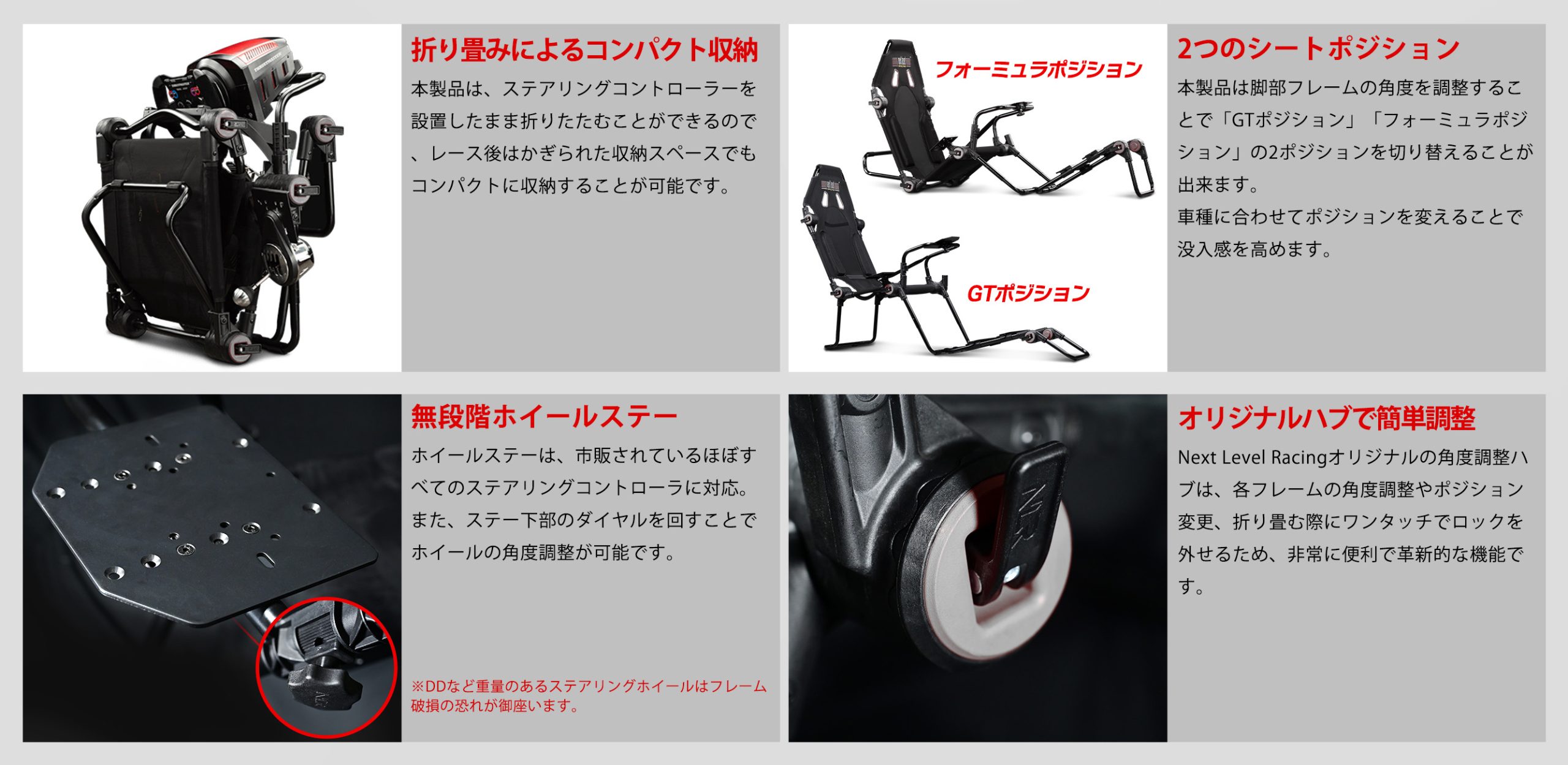 - 特許出願中のデザインにより、フォーミュラとGTポジションが可能