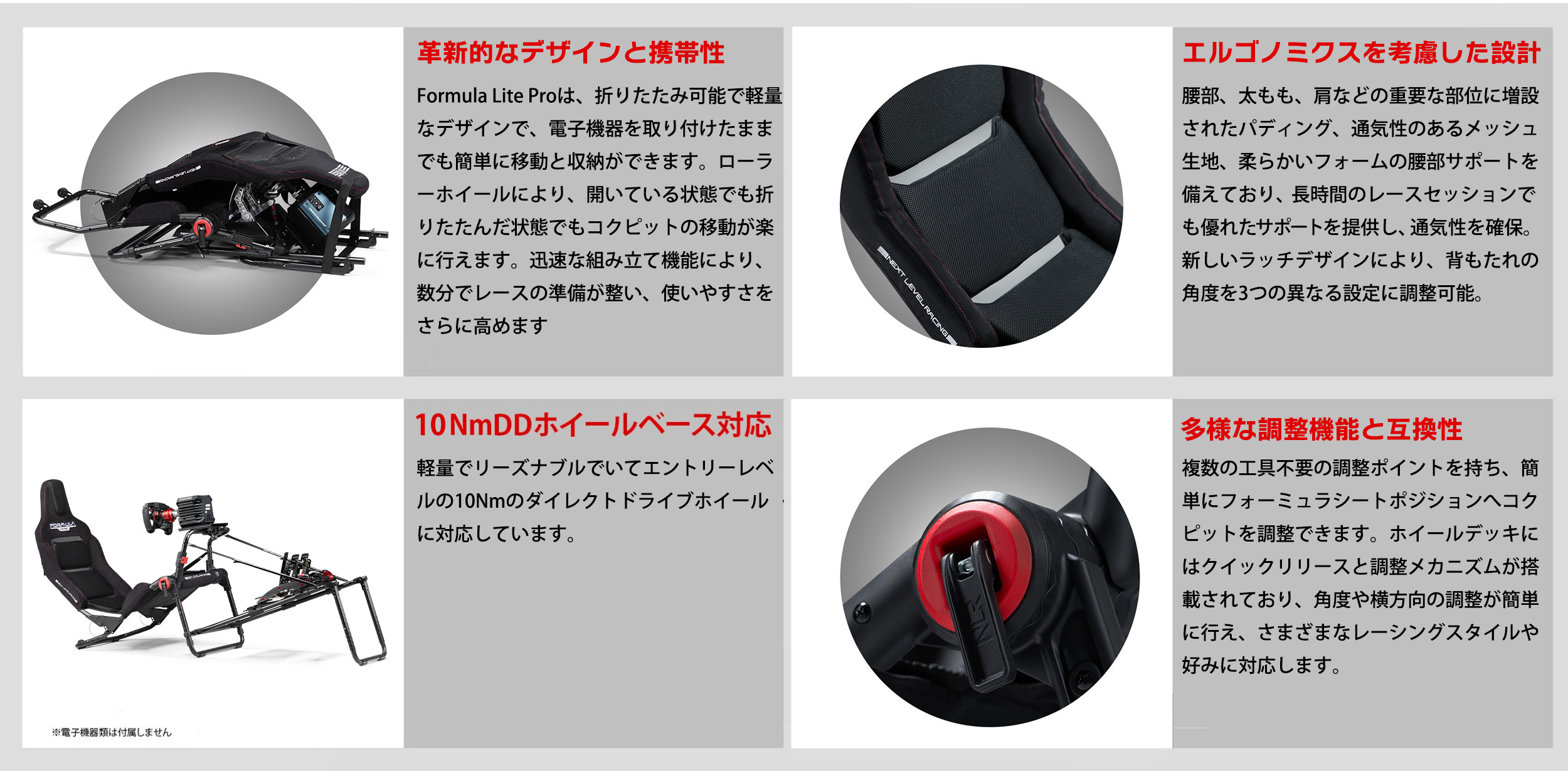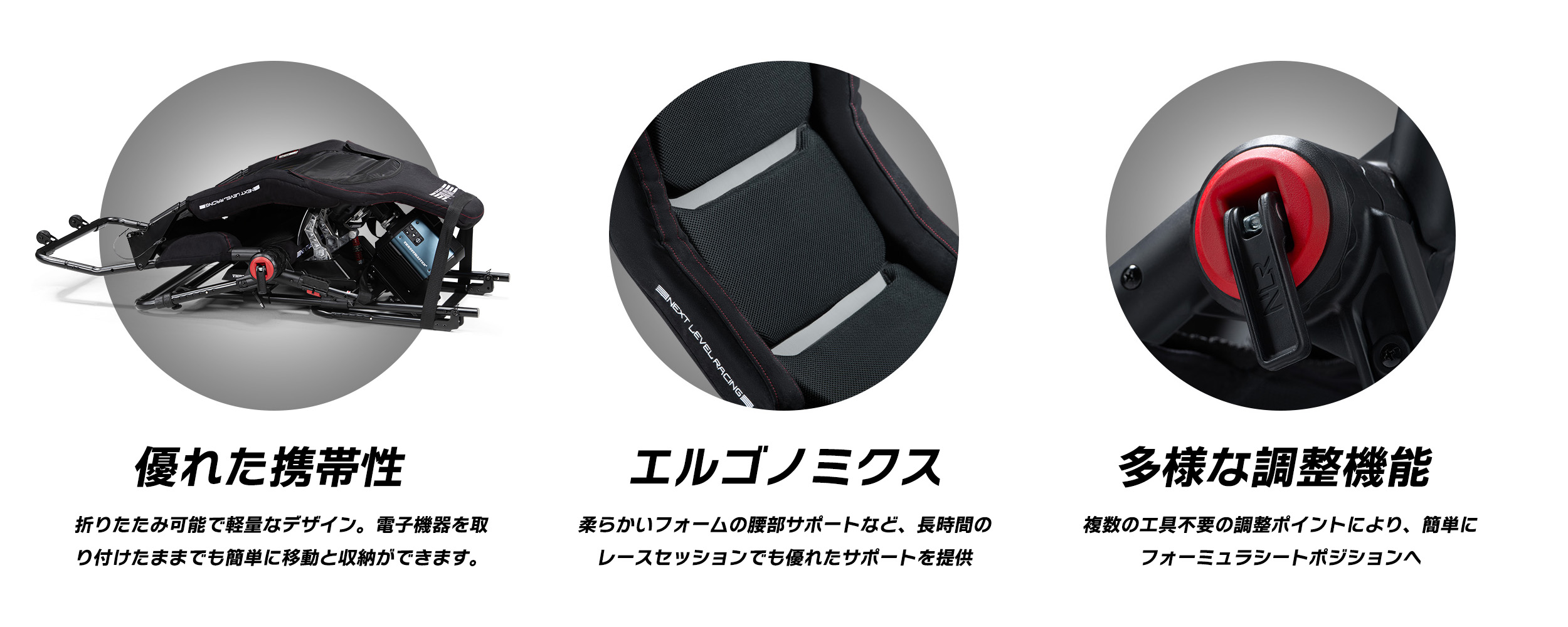 • リアルなフォーミュラシート、ペダル、およびホイールデッキの位置のための複数の工具不要の調整ポイント