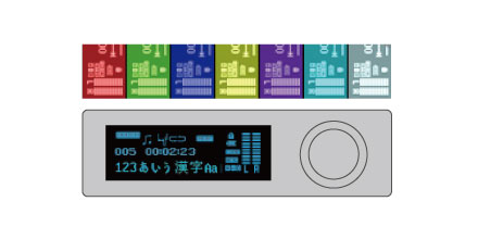 ワイドで見やすい3ライングラフィック液晶ディスプレイを搭載し、日本語・英語・中国語・韓国語・ヨーロッパ言語(UNICODE)で曲名表示※ができます。レッド・グリーン・ブルー・イエロー・マゼンタ・シアン・ホワイトの7色の中から好きなカラーで、暗いところでも操作可能です。※曲名表示はMP3のID3タグのみ対応。MP3以外はファイル名表示になります。