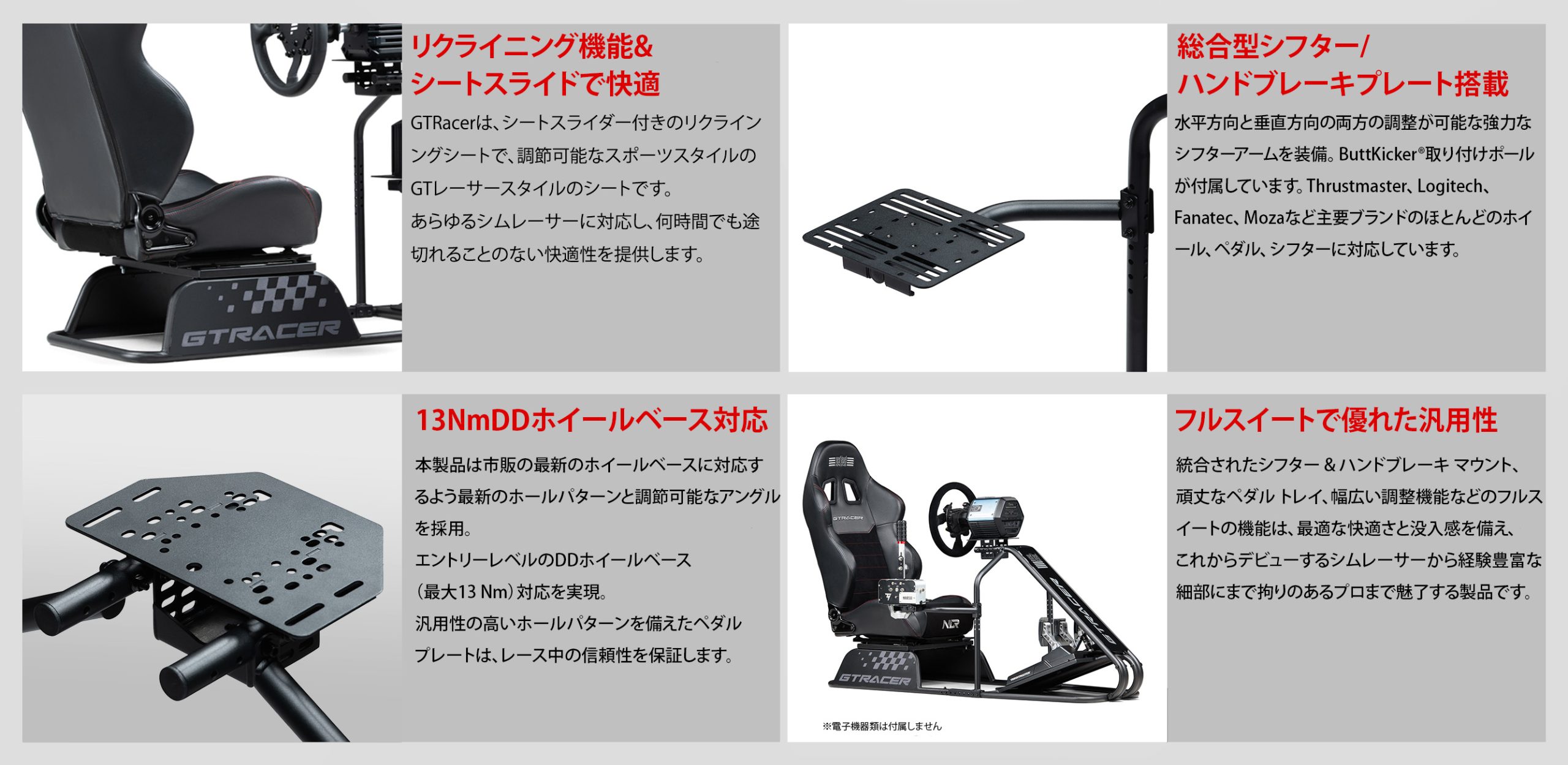 • 主要ブランドのほとんどのホイール、ペダル、シフターに対応:Thrustmaster、Logicool、Fanatec、Moza