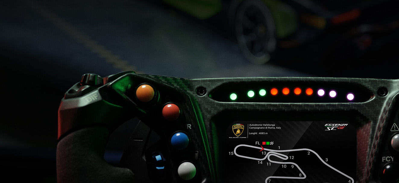 アルミニウム合金で作られたパドルシフターは、実際の Automobili Lamborghini Squadra Corse レースカーの素材と構造を再現しています。鋭く反応の良い感触を実現するように設計されており、何百万サイクルにも耐えられるようにテストされており、耐久性があり信頼性の高いパフォーマンスを保証します。