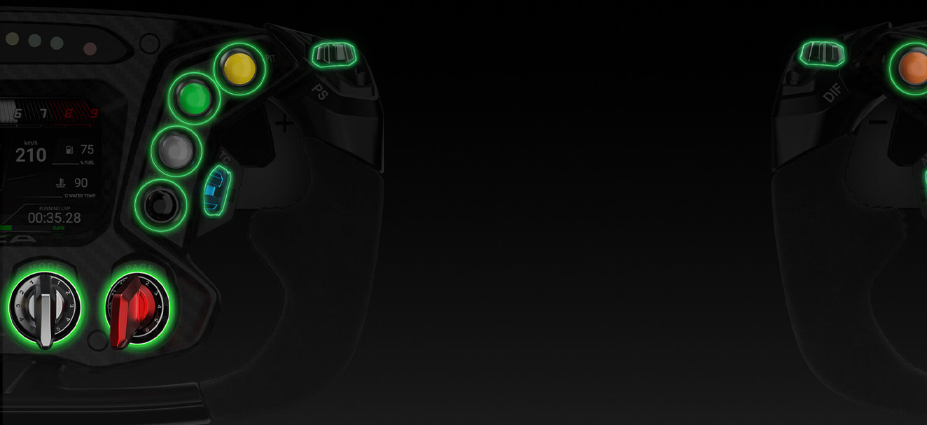 使いやすさのために最適に設計されたこのホイールは、8 個の丸いボタン、4 個のサムノブ、4 個の 12 ポジション回転ノブを含む 72 個のプログラム可能な入力を備えた人間工学に基づいたレイアウトを提供し、ブレーキバイアス、トラクションコントロール、ABS などを簡単に調整できます。CNC 陽極酸化アルミニウムノブキャップは耐久性を確保し、高級感を加えます。