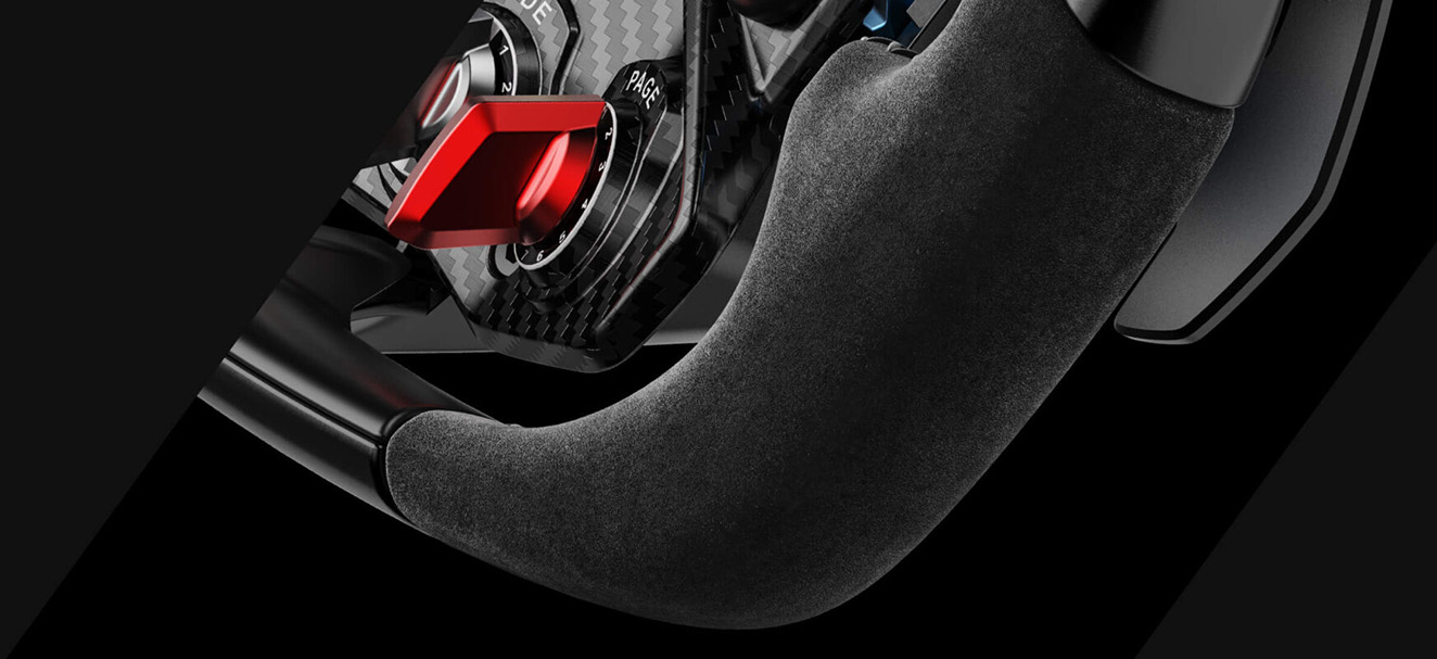 スエードレザーグリップは、 本物の Automobili Lamborghini Squadra Corse レースカーと 同じ高品質の素材で作られており、高級感と優れたコントロール性を保証します。