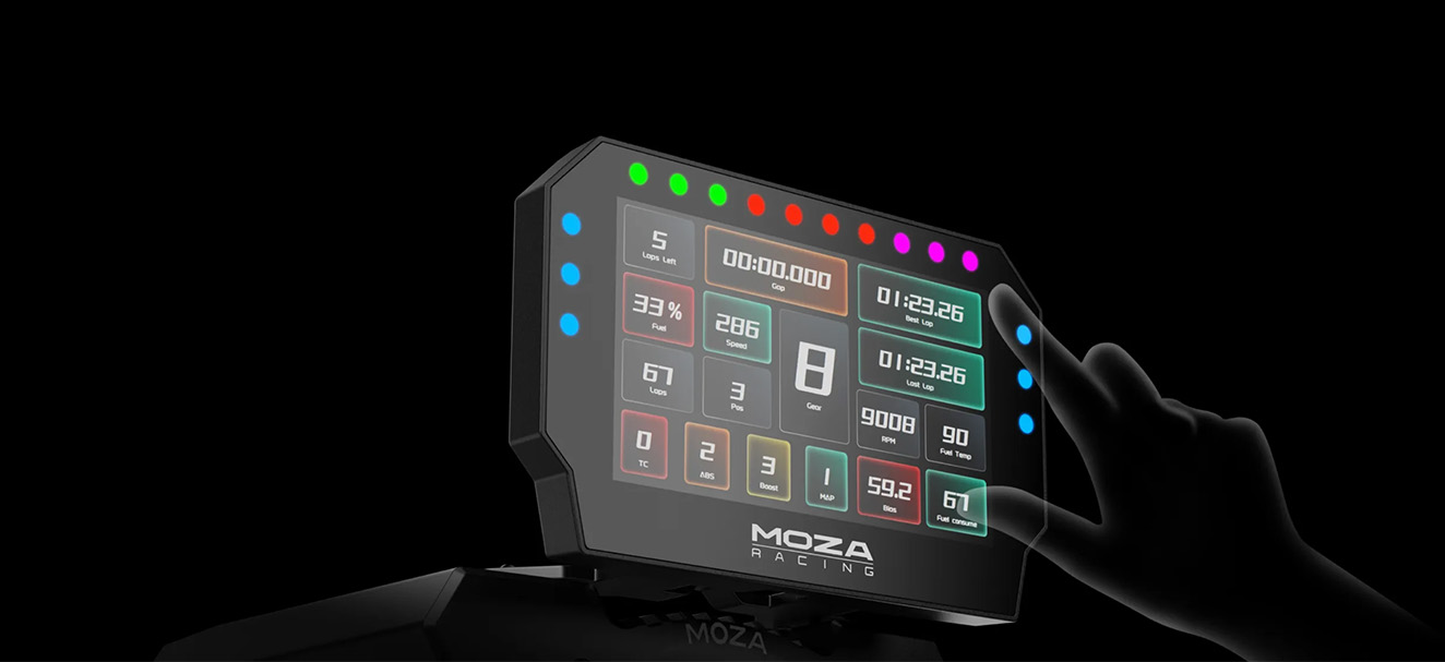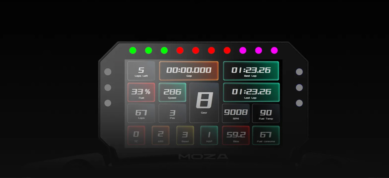 すべての MOZA ダイレクトドライブ ホイールベースと互換性のあるこのダッシュボードは、さまざまな座席位置に合わせて高さを調整できるため、クリアな視界と快適性が確保されます。