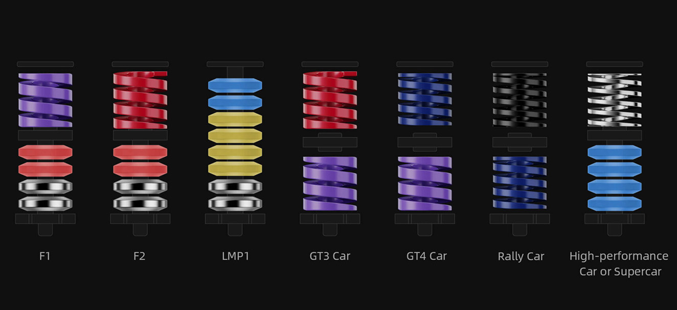 パフォーマンス キットには、10 個のスプリング、各種ダンピング ブロック、および金属ブロックが含まれています。オリジナルのダンピング ブロックと組み合わせることで、1,764 通りのペダル フィール構成が可能になり、ブレーキ力の応答時間がほぼゼロで、F1 や F2 などのトップ クラスのレース カーのハード ブレーキ フィールをシミュレートします。