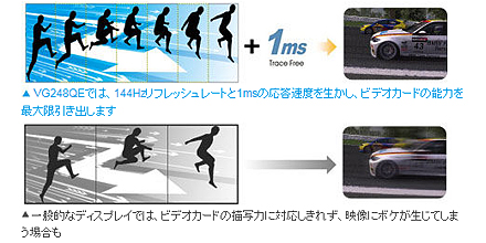 リフレッシュレート144Hzの高速駆動と、1msの応答速度(グレー→グレー)の組み合わせによるTrace Free IIテクノロジーを搭載。